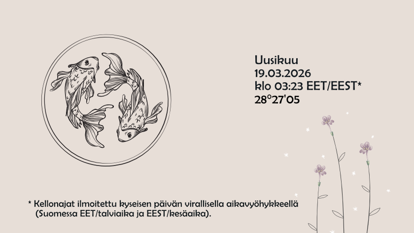 Torstaina 19.03. Uusikuu muodostuu Kalojen merkissä asteluvulla 28°27. Uusikuu aloittaa aina uuden syklin Auringon ja Kuun syleillessä toisiaan. Tämä on suotuisaa aikaa aloittaa jotain Uudenkuun merkin teemaan sopivaa, esimerkiksi uusi projekti tai harrastus.