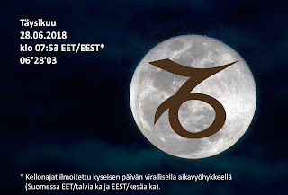 Torstaina 28.06. Täysikuu muodostuu Kauriin merkissä 06°28. Ravun merkissä vaikuttava Aurinko tekee tarkkaa oppositiota Kauriin merkissä vaikuttavaan Kuuhun. Opposition luonteen mukaisesti nämä merkit symbolisoivat toistensa vastakohtia. Rapu-Kauris -akselilla on kyse tunteen ja järjen välisestä tasapainosta. Intuitiivisen Ravun huolehtiva energia vaalii rakkauden lämmöllä kotia ja yksityisyyttä. Vastuuntuntoinen Kauriin energia rakentaa pitkäjänteisiä suunnitelmiaan kurinalaisuutta noudattaen. Tämä Täysikuu tasapainottelee lähtökohtien ja tavoitteiden välillä.