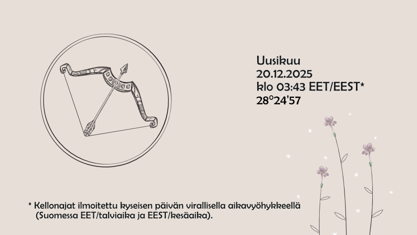 Lauantaina 20.12. Uusikuu muodostuu Jousimiehen merkissä asteluvulla 28°25. Uusikuu aloittaa aina uuden syklin Auringon ja Kuun syleillessä toisiaan. Tämä on suotuisaa aikaa aloittaa jotain Uudenkuun merkin teemaan sopivaa, esimerkiksi uusi projekti tai harrastus.