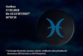 Uusikuu Kalojen merkissä 26°53 lauantaina 17.03. klo 15:12 EET*.