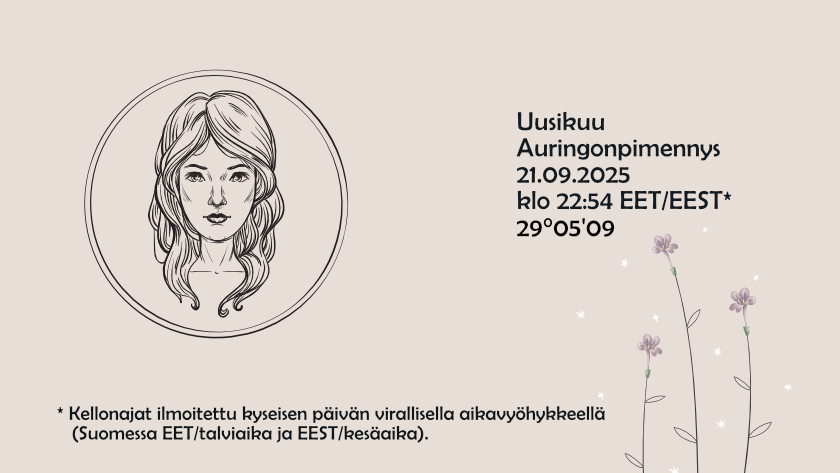 Uusikuu Neitsyen merkissä 29°05 sunnuntaina 21.09. klo 22:54 EET/EEST*.
