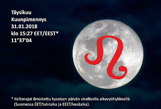 Keskiviikkona 31.01. Täysikuu muodostuu Leijonan merkissä 11°37. Vesimiehen merkissä vaikuttava Aurinko tekee tarkkaa oppositiota Leijonan merkissä vaikuttavaan Kuuhun. Opposition luonteen mukaisesti nämä merkit symbolisoivat toistensa vastakohtia. Leijona-Vesimies-akselilla on kyse romanssin ja ystävyyden välisestä tasapainosta. Itsevarman Leijonan huomionhakuinen energia viihtyy ihailijoiden ympäröimänä, kun taas Vesimiehen viileän radikaali energia etsii ennen kaikkea samanhenkisyyttä. Täysikuu Vesimiehessä tasapainottelee yksilön ja tiimin, henkilökohtaisten ja yhteisten saavutusten välillä. Tämän Täysikuun vaikutus on normaalia voimakkaampi, sillä kyse on Kuunpimennyksestä. Voimme tuntea tämän Täydenkuun vaikutuksen vielä 6 kuukautta varsinaisen pimennyksen jälkeen. Kuten aina Täydenkuun aikaan Auringon ja Kuun ollessa vastakkaisissa merkeissä, Kuunpimennyksessä on kyse kahden vastakkaisen osapuolen tasapainosta ja niiden suhteesta toisiinsa. Niinpä Kuunpimennys kuin Täysikuukin aktivoi meidän mielessämme usein suhdeteeman. Kuunpimennyksen aikana kiinnitämme huomiomme siihen, mitä tarvitsemme, mitä meiltä puuttuu, mitä haluamme. Nyt on aika kysyä itseltämme, olemmeko tyytyväisiä ihmissuhteissamme, onko työ- ja yksityiselämämme tasapainossa jne.. Pinnan alla kytenyt nousee nyt näkyviin ja vaatii meitä toimimaan.