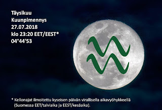 Perjantaina 27.07. Täysikuu muodostuu Vesimiehen merkissä 04°45. Tämä Täysikuu on samalla Kuunpimennys. Auringon- ja Kuunpimennys on vaikutukseltaan huomattavasti voimakkaampi kuin normaali Uusi- ja Täysikuu. Pimennyksen vaikutus yltää aina jopa 6 kuukautta varsinaisen pimennyksen jälkeen. Kuten aina Täydenkuun aikaan Auringon ja Kuun ollessa vastakkaisissa merkeissä, Kuunpimennyksessä on kyse kahden vastakkaisen osapuolen tasapainosta ja niiden suhteesta toisiinsa. Niinpä Kuunpimennys kuin Täysikuukin aktivoi meidän mielessämme usein suhdeteeman. Kuunpimennyksen aikana kiinnitämme huomiomme siihen, mitä tarvitsemme, mitä meiltä puuttuu, mitä haluamme ja olemmeko tyytyväisiä ihmissuhteissamme.