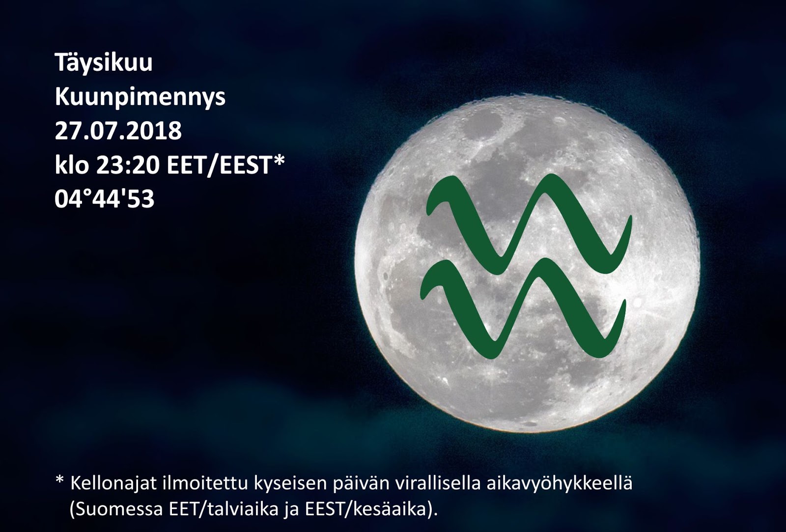 Perjantaina 27.07. Täysikuu muodostuu Vesimiehen merkissä 04°45. Tämä Täysikuu on samalla Kuunpimennys. Auringon- ja Kuunpimennys on vaikutukseltaan huomattavasti voimakkaampi kuin normaali Uusi- ja Täysikuu. Pimennyksen vaikutus yltää aina jopa 6 kuukautta varsinaisen pimennyksen jälkeen. Kuten aina Täydenkuun aikaan Auringon ja Kuun ollessa vastakkaisissa merkeissä, Kuunpimennyksessä on kyse kahden vastakkaisen osapuolen tasapainosta ja niiden suhteesta toisiinsa. Niinpä Kuunpimennys kuin Täysikuukin aktivoi meidän mielessämme usein suhdeteeman. Kuunpimennyksen aikana kiinnitämme huomiomme siihen, mitä tarvitsemme, mitä meiltä puuttuu, mitä haluamme ja olemmeko tyytyväisiä ihmissuhteissamme.