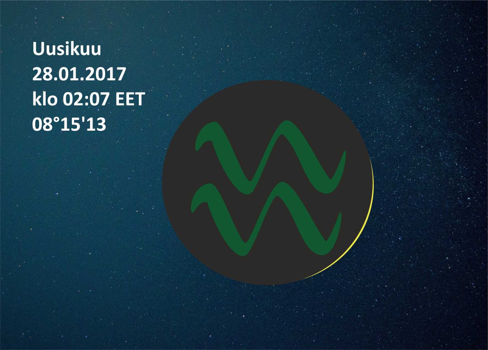 Uusikuu Vesimiehen merkissä 08°15 lauantaina 28.01. klo 02:07 EET.