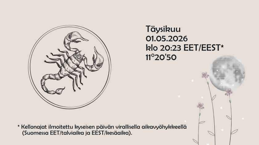 Skorpioni-Täysikuu valaisee taivaan perjantaina 01.05. Täysikuu muodostuu Skorpionin merkissä asteluvulla 11°21, kun Skorpionin merkissä vaikuttava Kuu tekee tarkkaa oppositiota Härän merkissä vaikuttavalle Auringolle. Opposition luonteen mukaisesti nämä merkit symbolisoivat toistensa vastakohtia. Niinpä Täydenkuun teemaan liittyy juurikin tasapainon löytäminen näiden kahden vastakkaisen energian välillä.