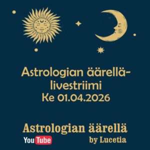 Astrologian äärellä on ammattiastrologi Jaana Rusin livestriimi, jota voit seurata suorana lähetyksenä Lucetian YouTube-kanavalla (www.youtube.com/@Lucetia) ja Facebook-sivulla. Astrologian äärellä -striimissä Jaana käsittelee ajankuvaan liittyviä astrologisia aspekteja. Edellä mainitun lisäksi Jaana käsittelee striimissään erilaisia astrologisia teemoja, jotka omalta osaltaan lisäävät itsetuntemusta.