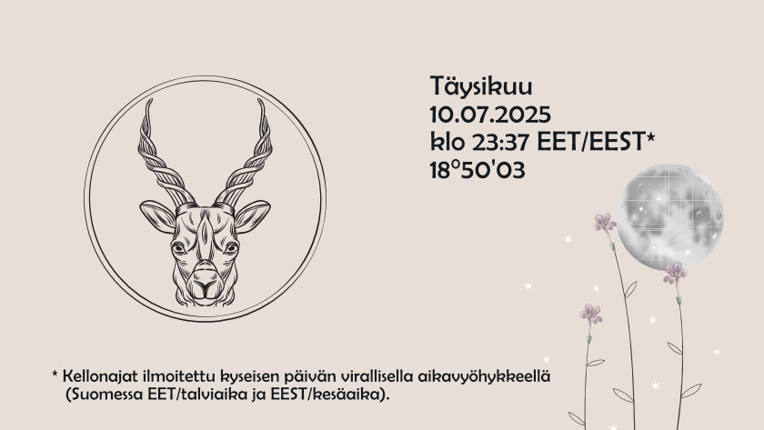 TäysikuuKauriin merkissä 18°50 torstaina 10.07. klo 23:37 EET/EEST*.
