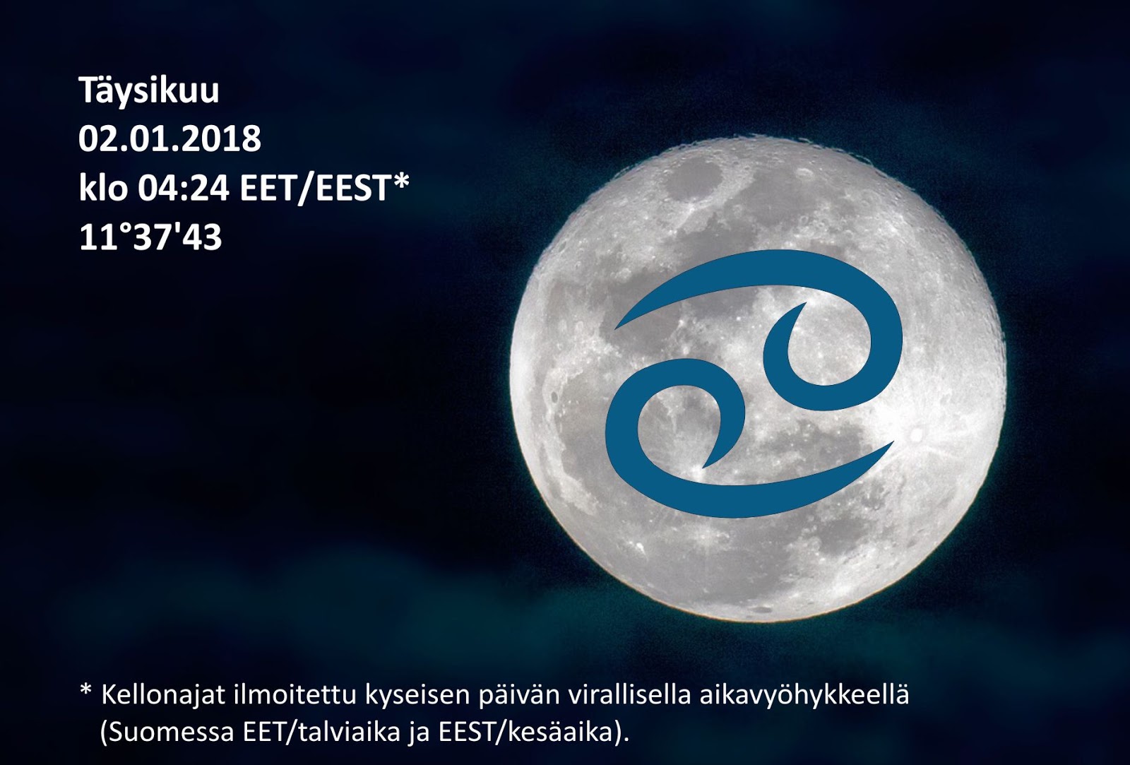 Täysikuu Ravun merkissä 11°38 tiistaina 02.01. klo 04:24 EET*.